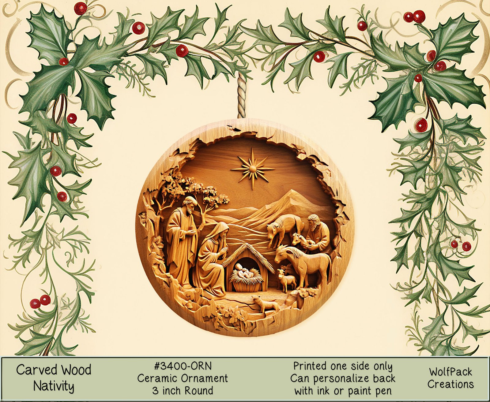 Enhance your holiday decor with our exquisite 3″ Christmas Ornament Carved Wood-Look Nativity. Crafted from premium ceramic, this round ornament beautifully captures the essence of the holiday season with its intricate nativity scene and wood-like finish. Add a touch of charm and tradition to your Christmas tree this year.