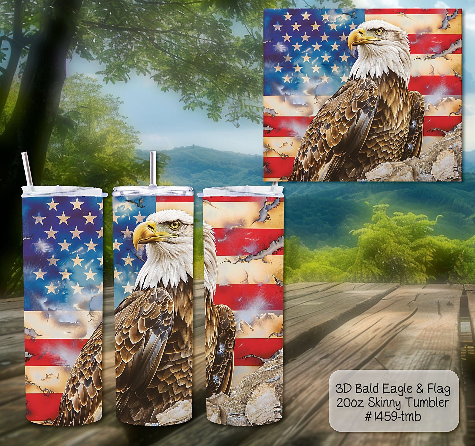 Pick up this tumbler featuring a 3D bald eagle and American flag.