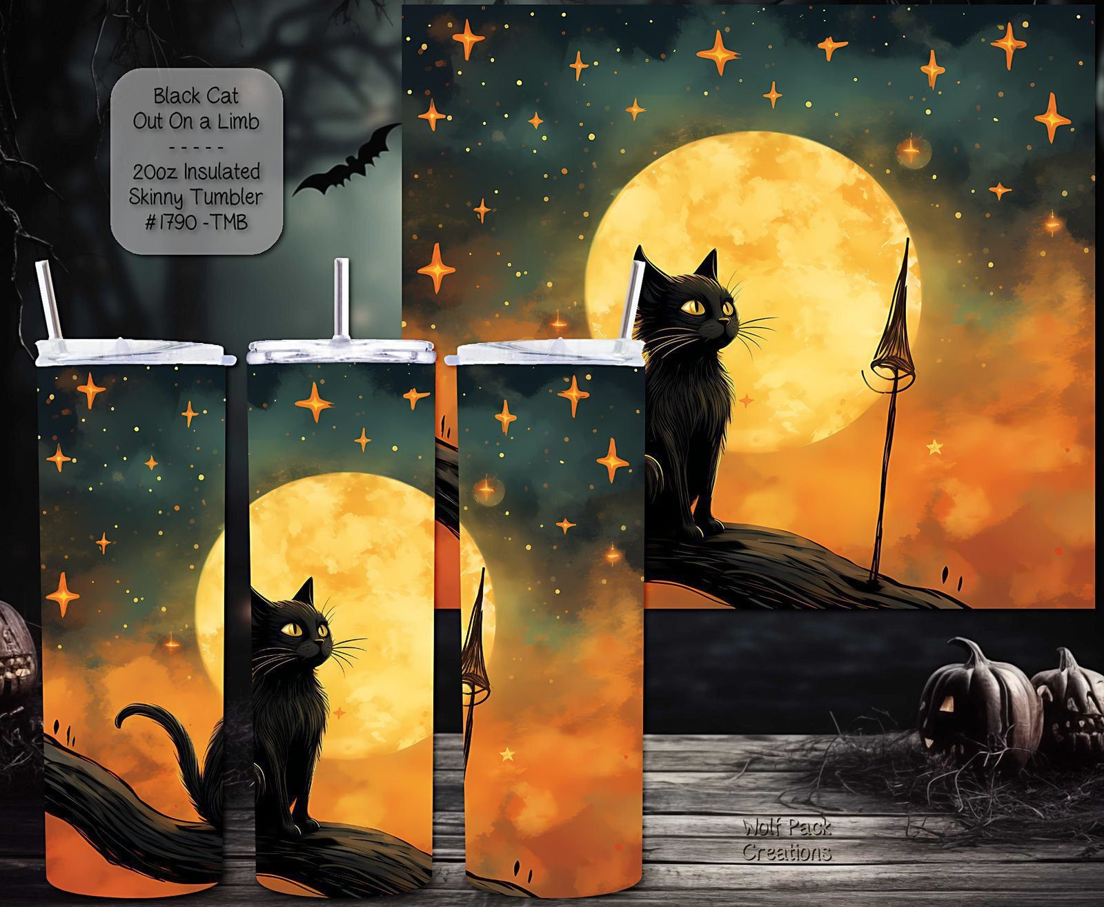 The tumbler features an enchanting black cat design set against a serene forest backdrop. This stylish touch makes it not just functional but also a delightful addition to your fall collection.