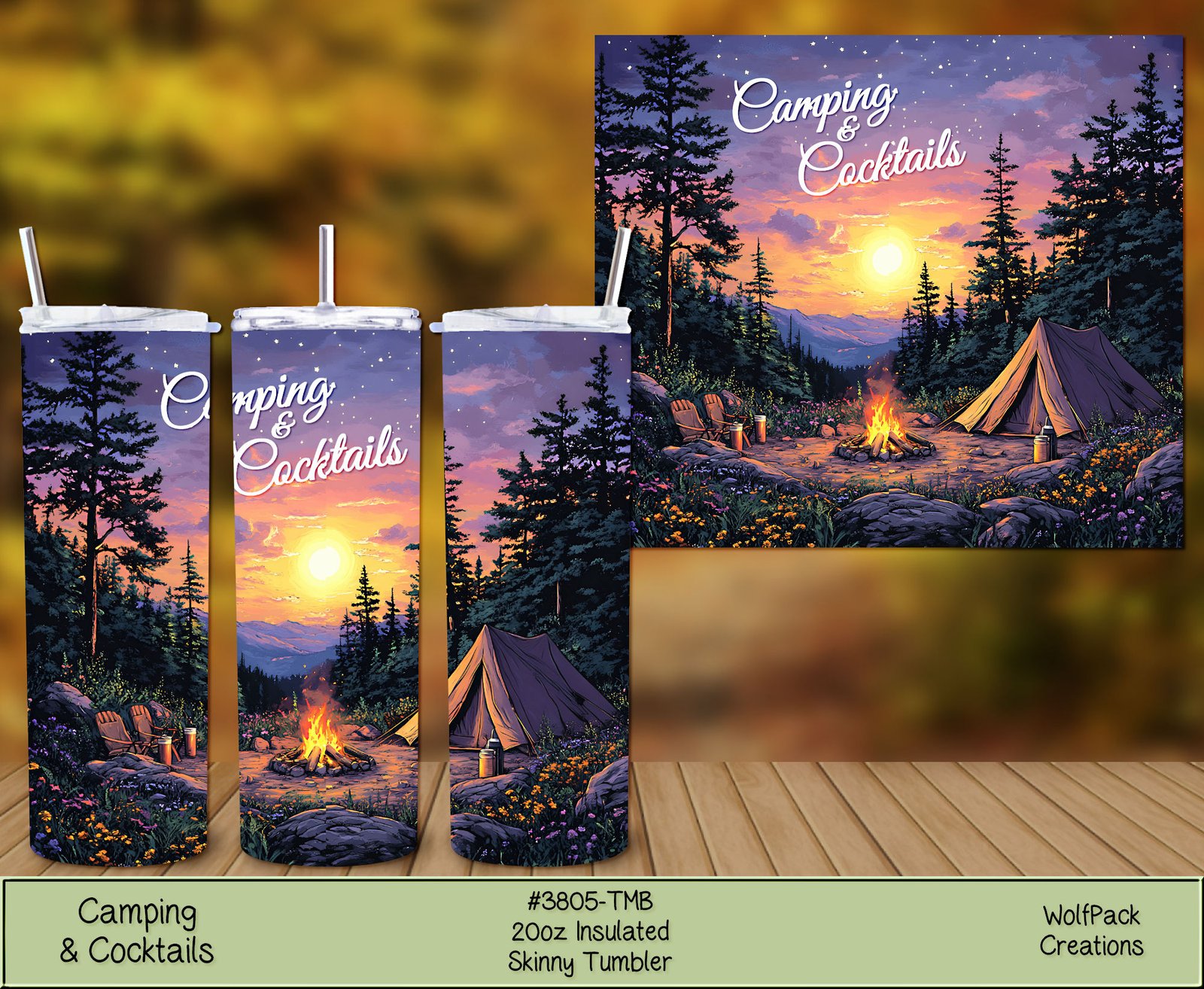 Introducing our Camping and Cocktails Tumbler, the ultimate companion for outdoor enthusiasts and mixology aficionados. Crafted from premium stainless steel and featuring vacuum insulation, this 20-ounce tumbler keeps your cocktails chilled and your coffee hot during camping adventures or backyard gatherings.