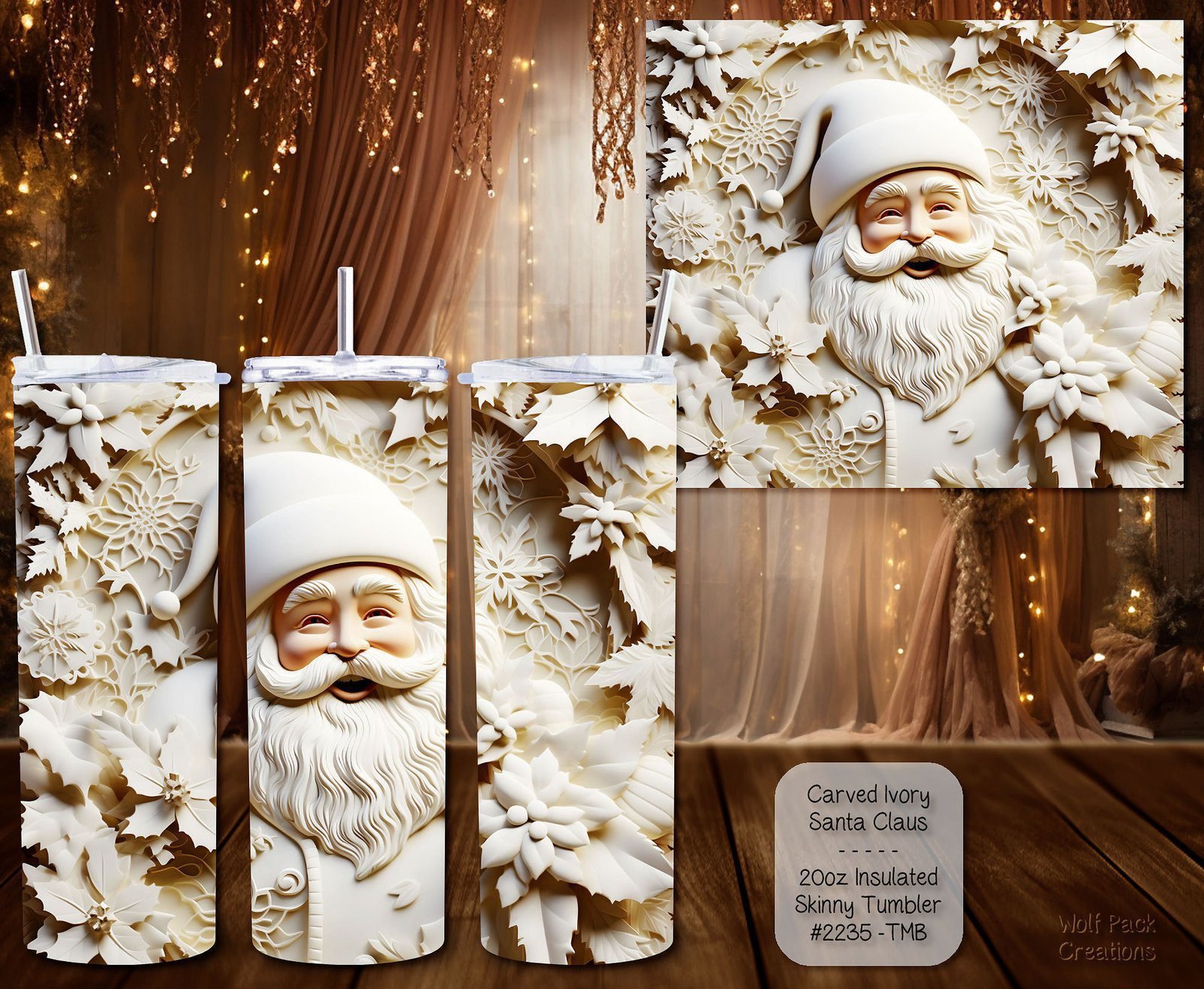 Experience the festive charm of our Carved Ivory Santa stainless steel skinny tumbler. This 20 ounce insulated masterpiece combines functionality with seasonal style, making it a perfect companion for your hot or cold beverages. Crafted from high-quality stainless steel, this tumbler ensures your drinks stay at the ideal temperature for hours.