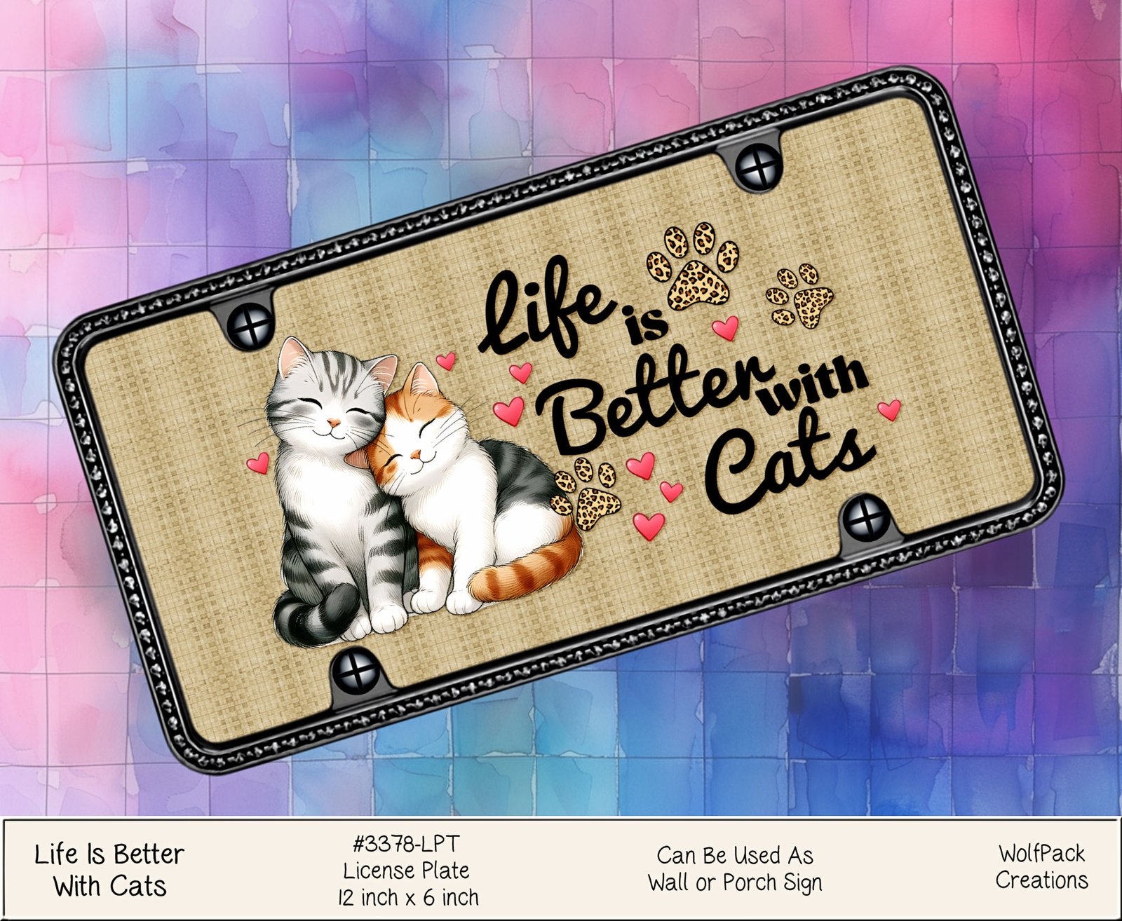 Enhance your vehicle with our “Life is better with cats” license plate. Show off your love for felines everywhere you go. This vanity plate features adorable paw prints, adding a touch of charm to your car. Made from durable materials, it withstands all weather conditions, ensuring long-lasting enjoyment. Let your passion for cats shine on the road!