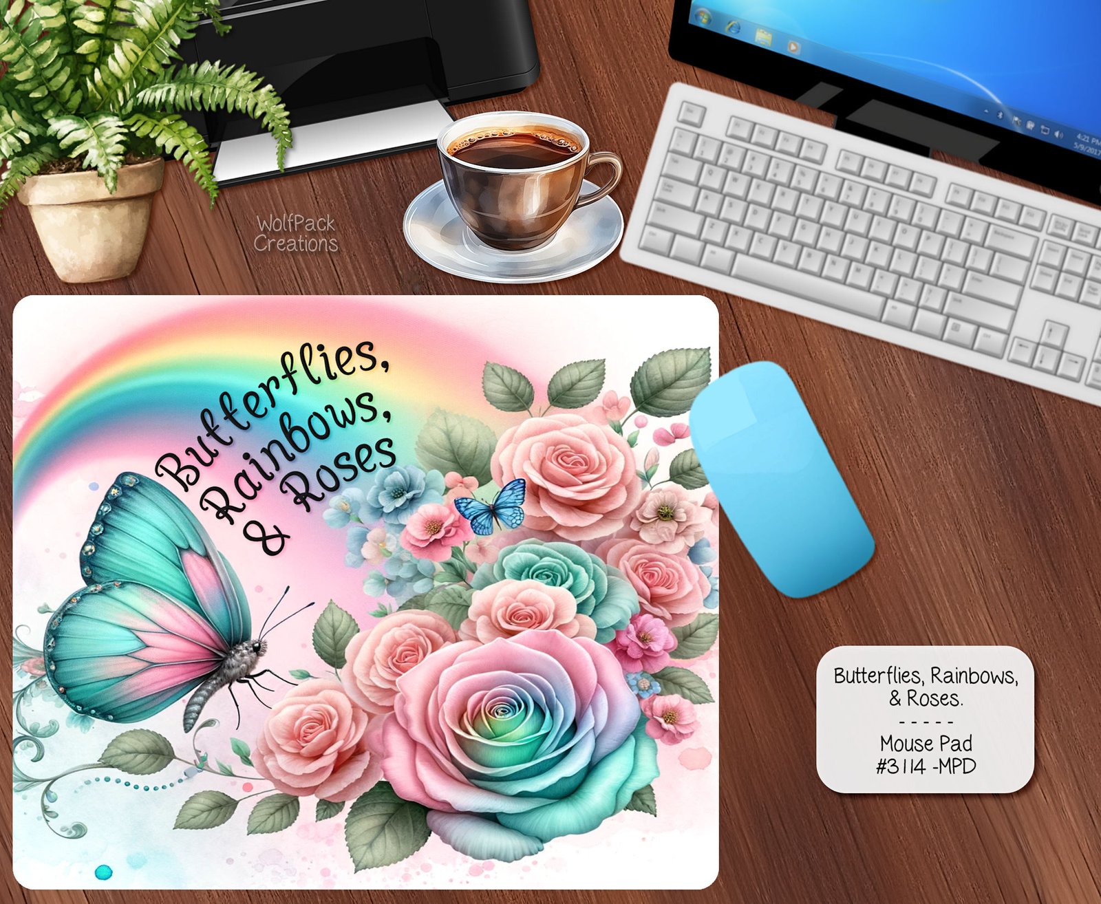 Elevate your workspace with our enchanting Butterfly Rainbow and Roses Mousepad. Immerse yourself in a symphony of colors – from vibrant pinks to soothing blues, sunny yellows, and lush greens – all delicately woven into a stunning design. Glide your mouse effortlessly while adding a touch of nature-inspired beauty to your desk setup. Experience creativity and functionality in one accessory.