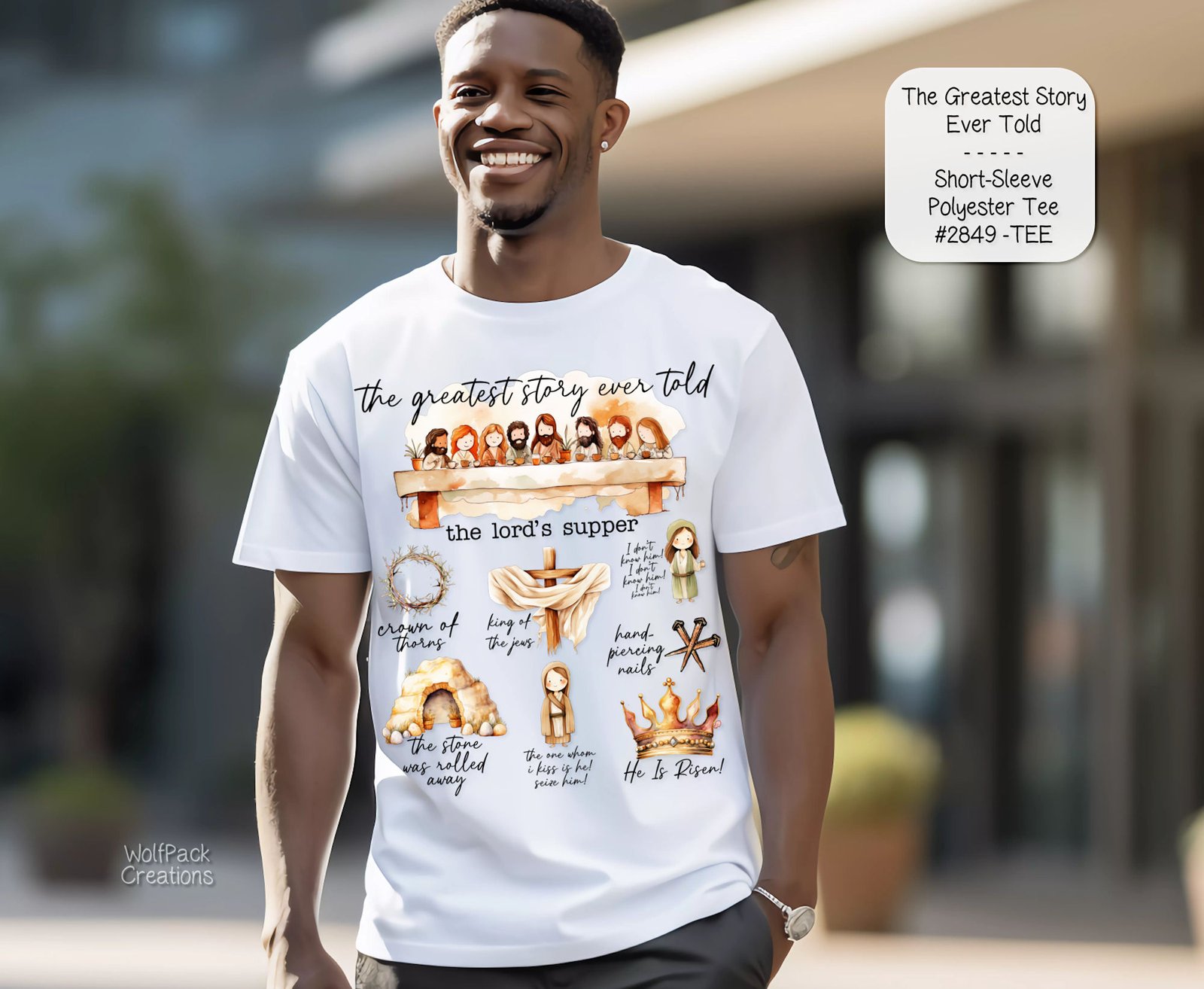 Celebrate Easter in style with our exclusive “Greatest Story Ever Told” t-shirt. Crafted from premium polyester, this holiday essential features a captivating design showcasing the Lord’s journey. Embrace the spirit of Easter with this comfortable, short-sleeve tee that beautifully captures the essence of the season. Stand out this Easter!
