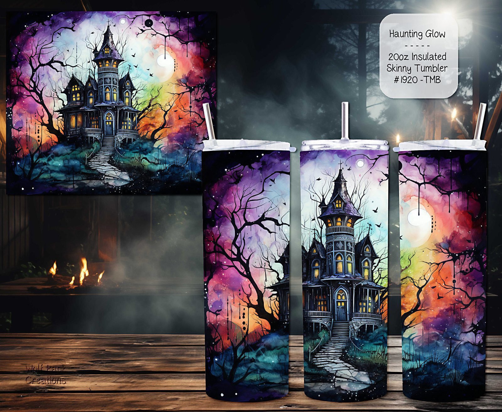 Adding a unique twist to its appearance, this skinny tumbler features an exclusive haunted castle design. An alluring choice for fans of spooky motifs, this design not only adds visual appeal but also makes the tumbler a standout item in your collection.
