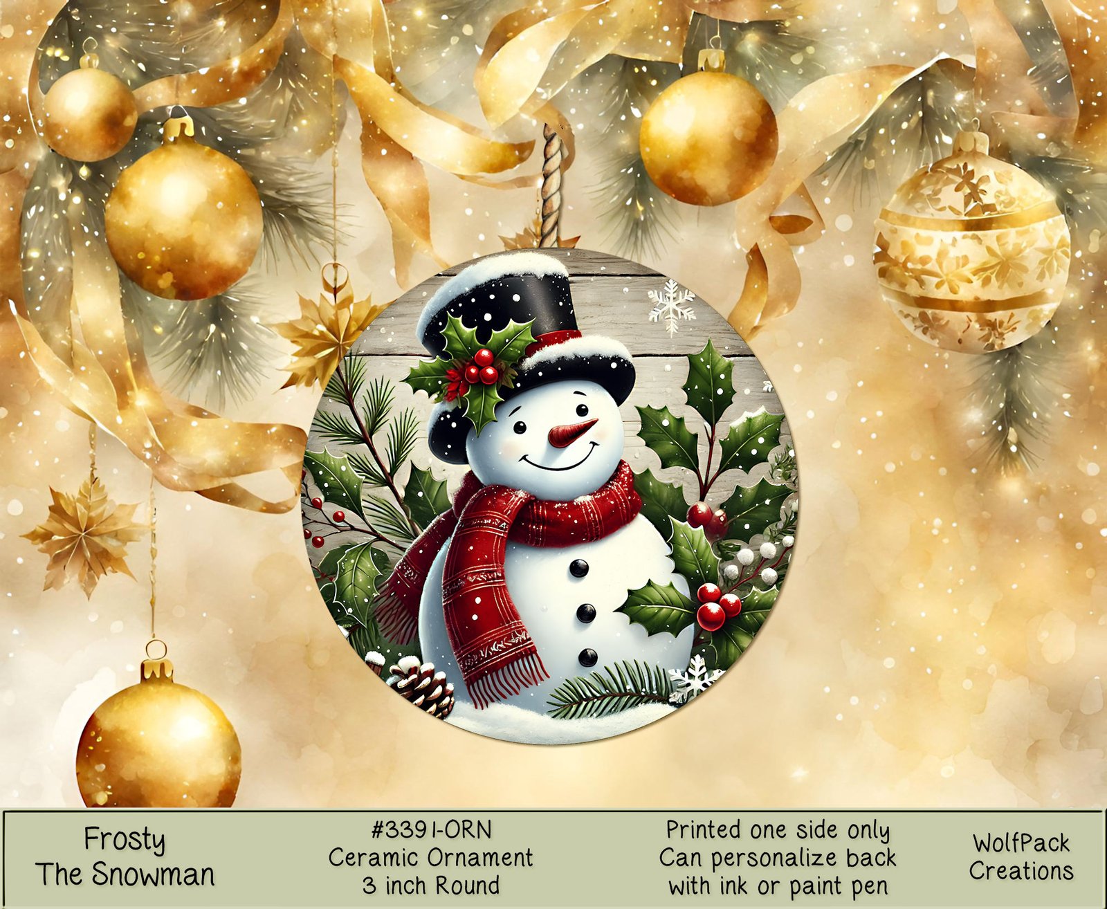 Add a touch of holiday cheer with our Frosty the Snowman Christmas ornament. Crafted from high-quality ceramic, this merry ornament features a round design adorned with holly and berries, perfect for spreading festive joy. Capture the magic of the season with this delightful snowman ornament for your holiday decor.