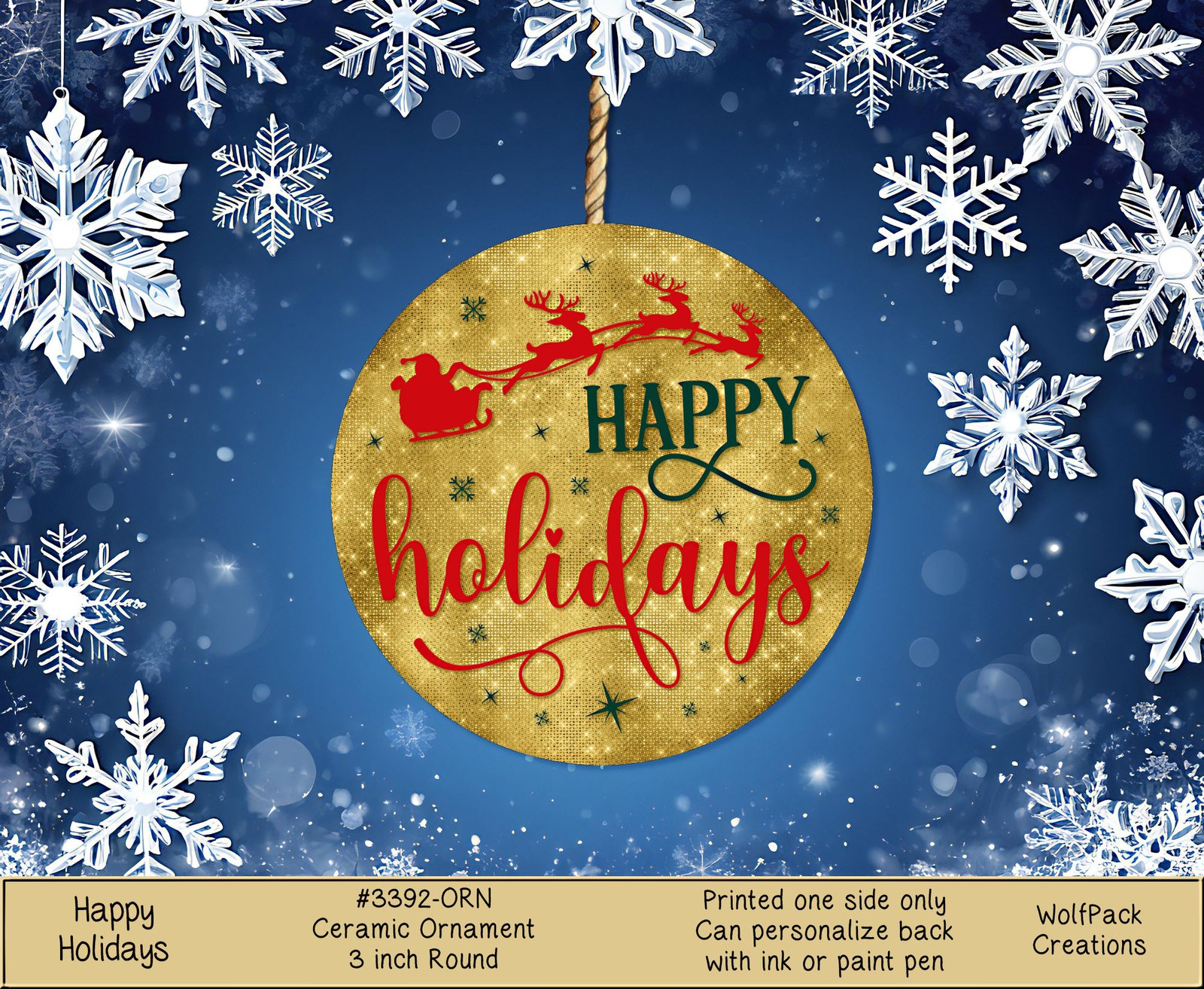 Elevate your holiday decor with our Happy Holidays Christmas Ornament. Crafted from premium ceramic in festive red, green, and gold hues, this round ornament features charming designs of reindeer, Santa, and sleigh. Add a touch of cheer to your tree and celebrate the season in style. Perfect for gifting or decorating your own space.