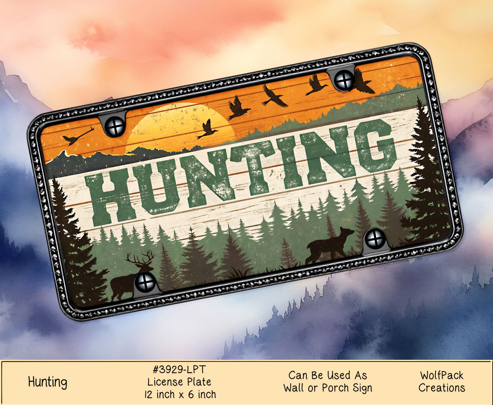 Show off your passion for hunting with our premium Aluminum Hunting License Plate. Featuring detailed designs of deer, birds, and trees, this vanity plate is a must-have for any hunting enthusiast’s vehicle. Durable and eye-catching, it’s the perfect way to stand out on the road. Get yours today!