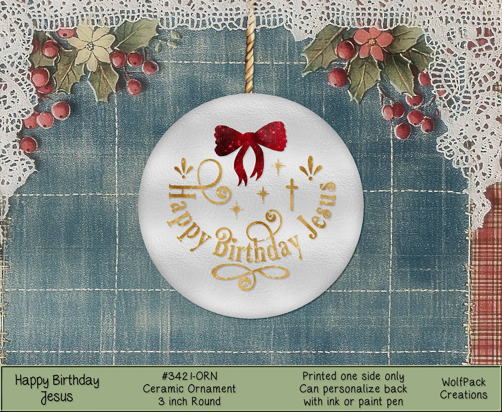 Celebrate the true spirit of Christmas with our Happy Birthday Jesus Christmas Ornament. Crafted from premium ceramic, this round ornament spreads cheer and joy during the holiday season. Add a touch of merry to your tree and honor the reason for the season with this special Jesus-themed decoration.
