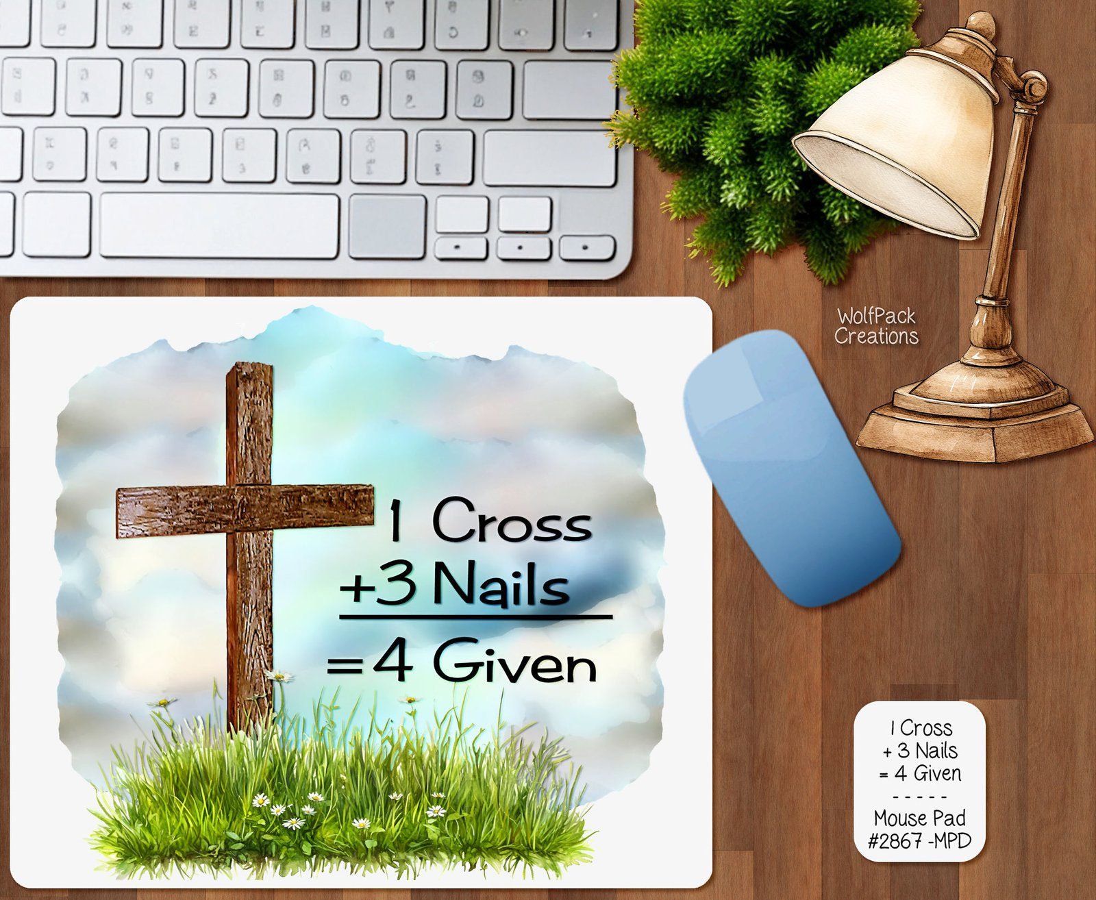 Elevate your computer experience with our premium neoprene and polyester mouse pad, specifically designed for efficiency and comfort. This mouse pad not only provides a smooth surface for accurate mouse movements but also adds a touch of inspiration to your desk space. Featuring a beautifully crafted design depicting a cross surrounded by nails, this unique mouse pad serves as a daily reminder of faith and resilience.