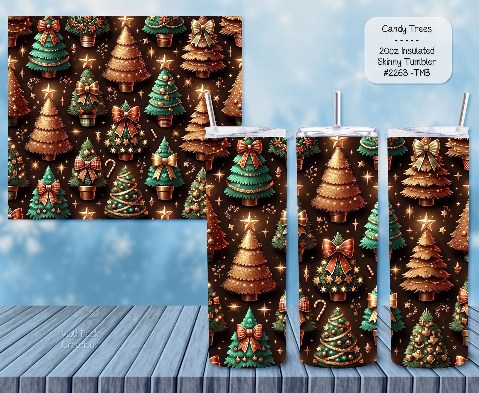 Introducing our stainless steel skinny tumbler, adorned with charming candy Christmas trees. This delightful design captures the festive spirit, making it the perfect companion for your holiday gatherings.