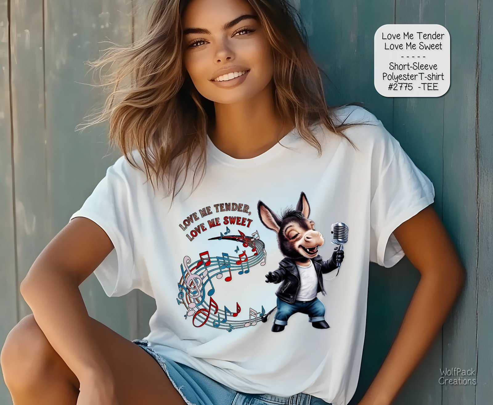 Valentine’s Day Love Me Tender Donkey T-Shirt – Short Sleeve Polyester