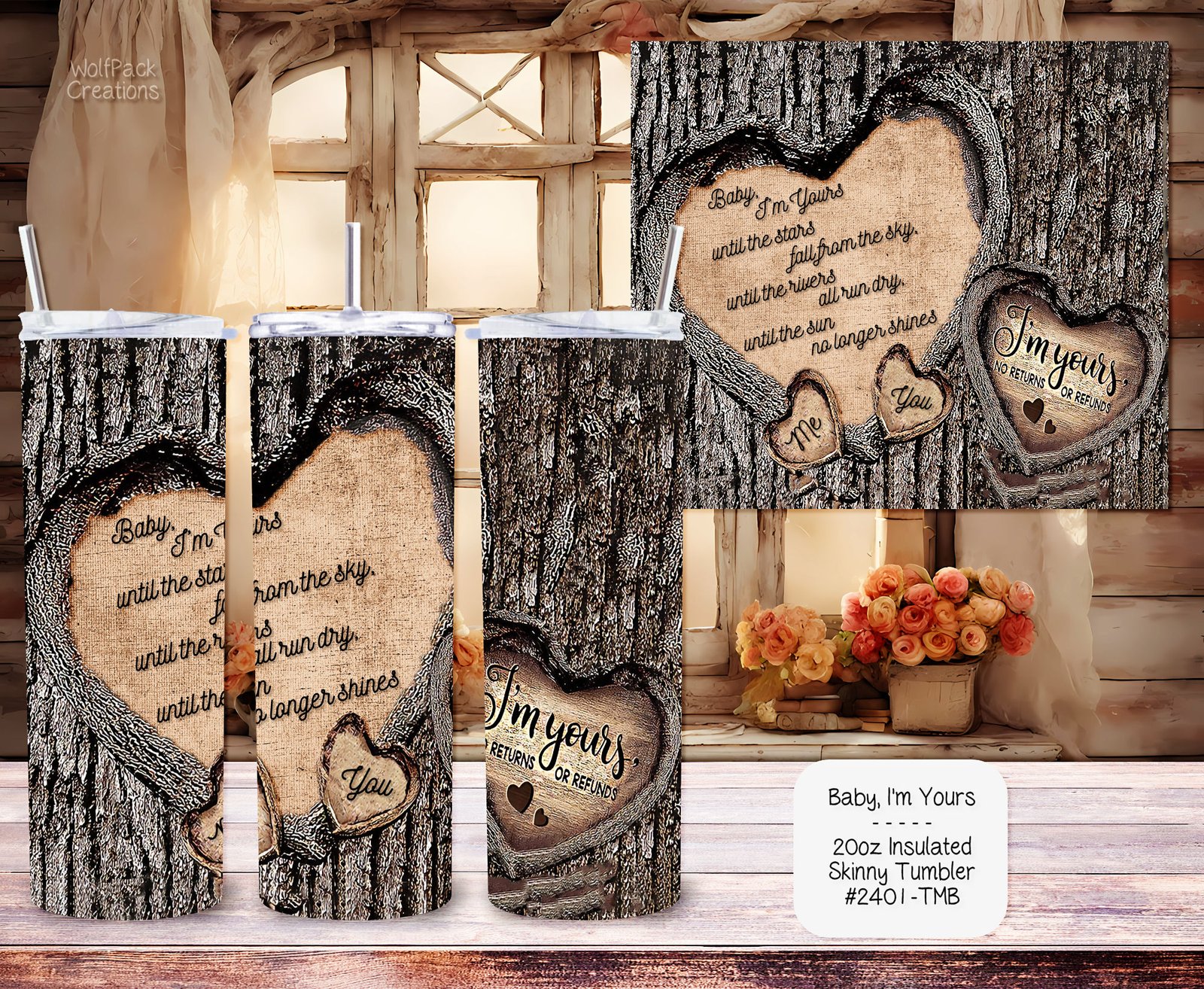 Enjoy your favorite beverages in style with our “Baby, I’m Yours” stainless steel tumbler this Valentine’s Day. Crafted with premium stainless steel and featuring intricate carvings resembling tree bark, this vacuum-insulated tumbler keeps your drinks at the perfect temperature for longer periods. Make every sip special with this unique and romantic cup.