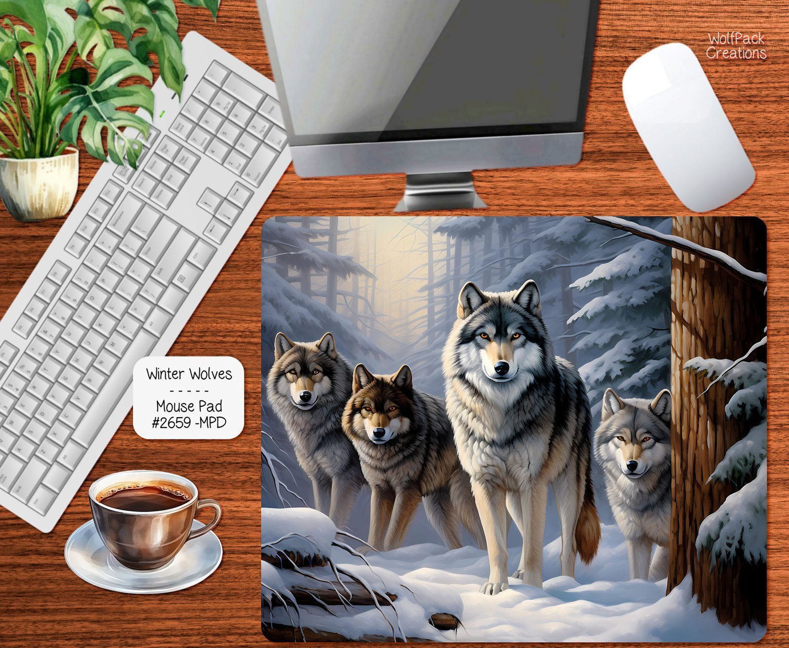 Elevate your workspace with our striking wolf-themed mouse pad. Crafted from high-quality neoprene and rubber, this rectangular mouse pad not only offers a smooth surface for effortless mouse movement but also brings a touch of nature’s beauty to your desk. The stunning design features majestic winter wolves, making it a perfect addition to any computer setup.